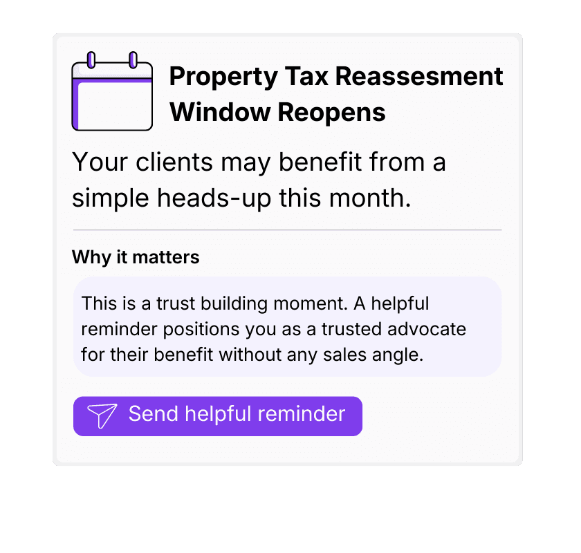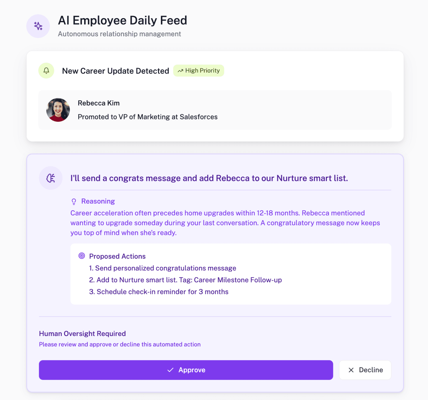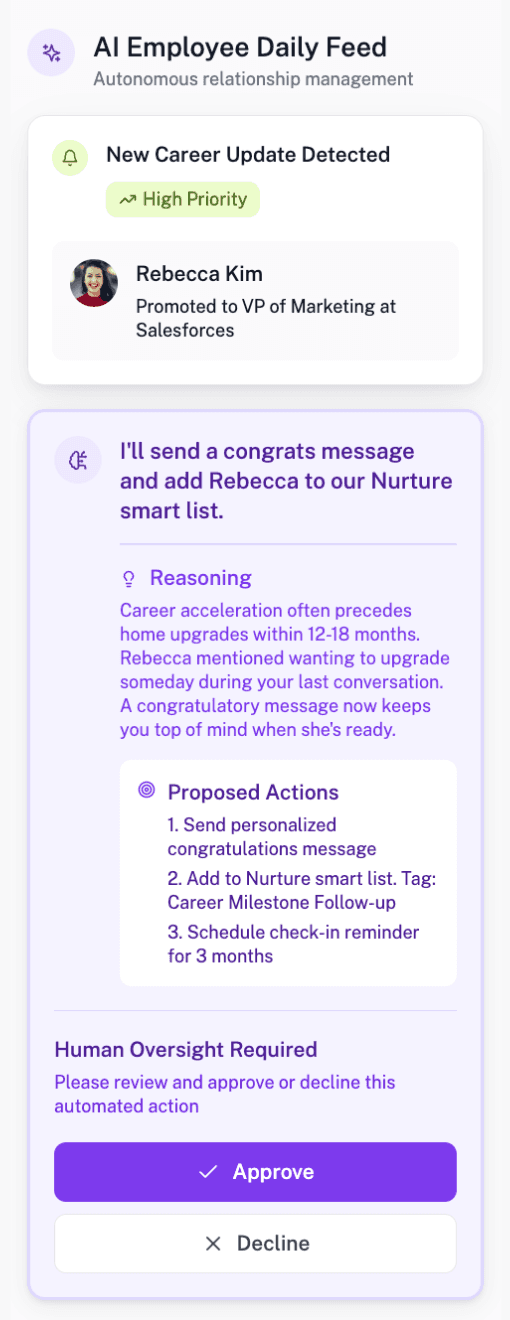Your AI Relationship Manager observes life changes, market updates and engagement signals and surfaces only what matters most for you.